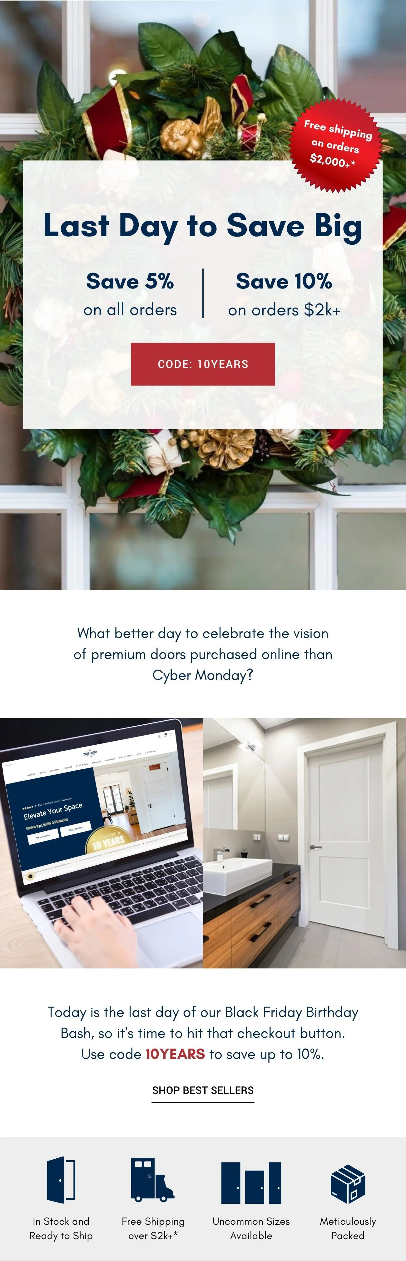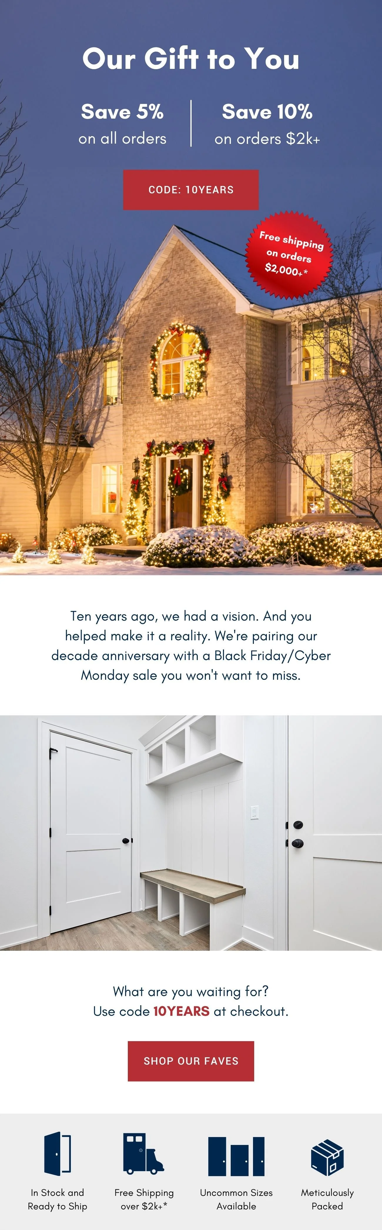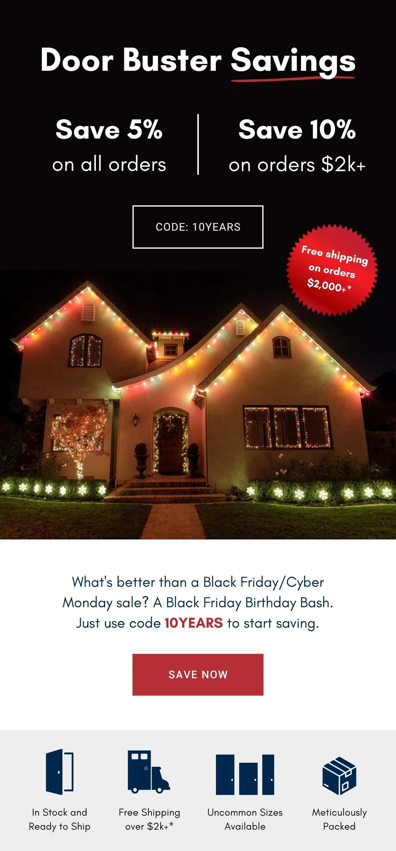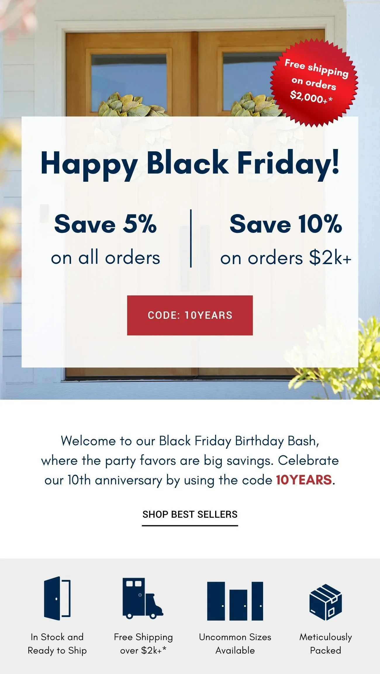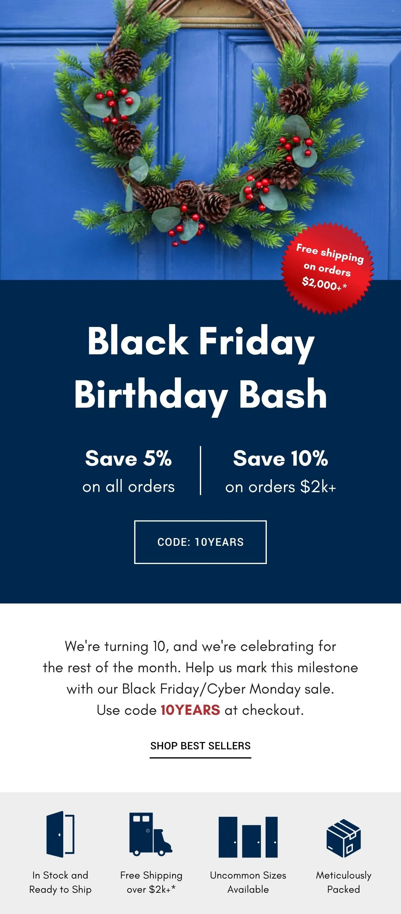 Primary Text: In honor of our 10-year anniversary, we're throwing a Black Friday Birthday Bash—but you get all the presents. Starting now, use code 10YEARS to get 5% off all orders and 10% off and free shipping on orders $2,000+.